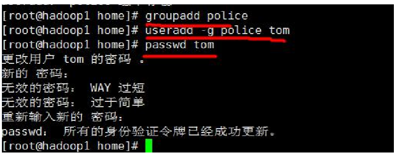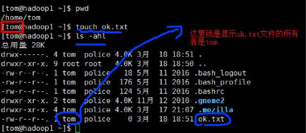 2)应用实例:创建一个组 police ,再创建一个用户 tom,将 tom 放在 police 组,然后使用 tom 来创建一个文件 ok.txt,看看情况如何。