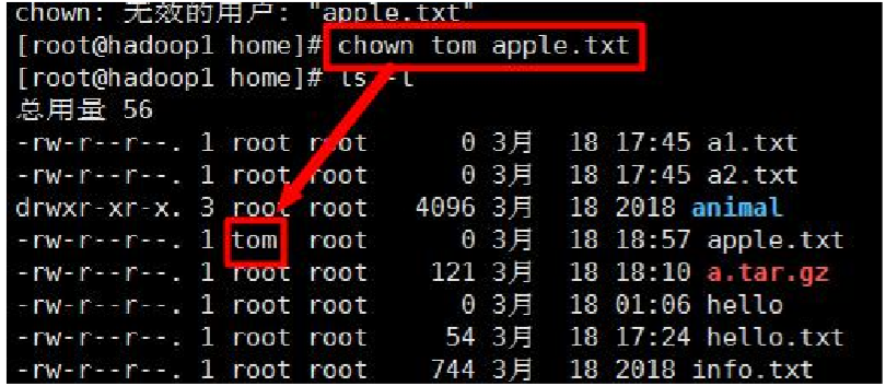 要求:使用 root 创建一个文件 apple.txt,然后将其所有者修改成 tom