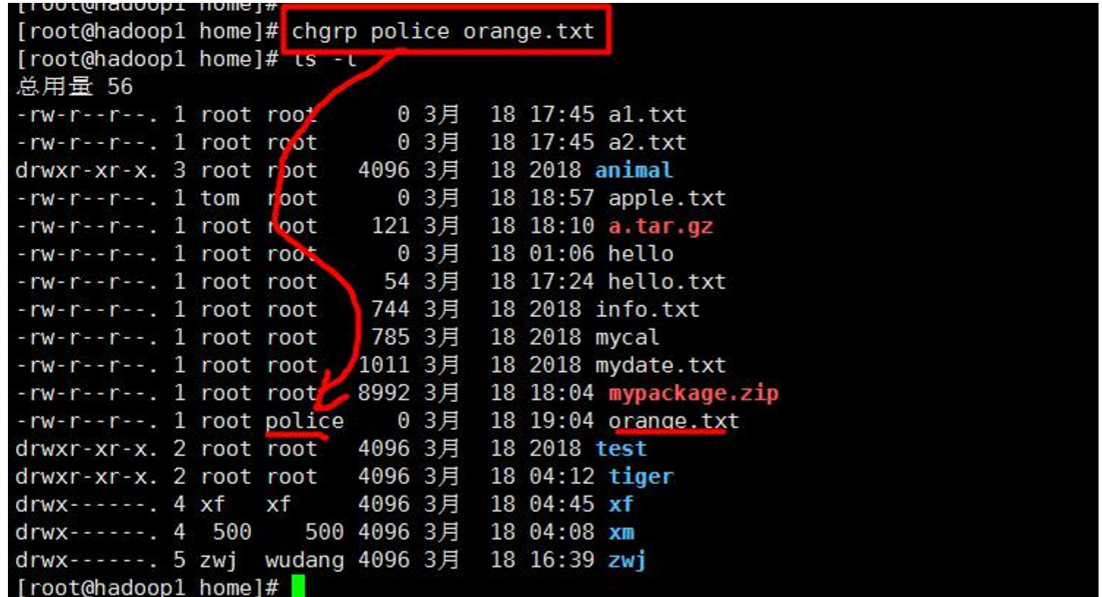 使用 root 用户创建文件 orange.txt,看看当前这个文件属于哪个组,然后将这个文件所在组,修改到 police 组。