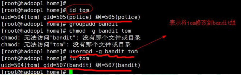 组建一个土匪组 (bandit)将 tom 这个用户从原来所在的 police 组,修改到 bandit (土匪)组