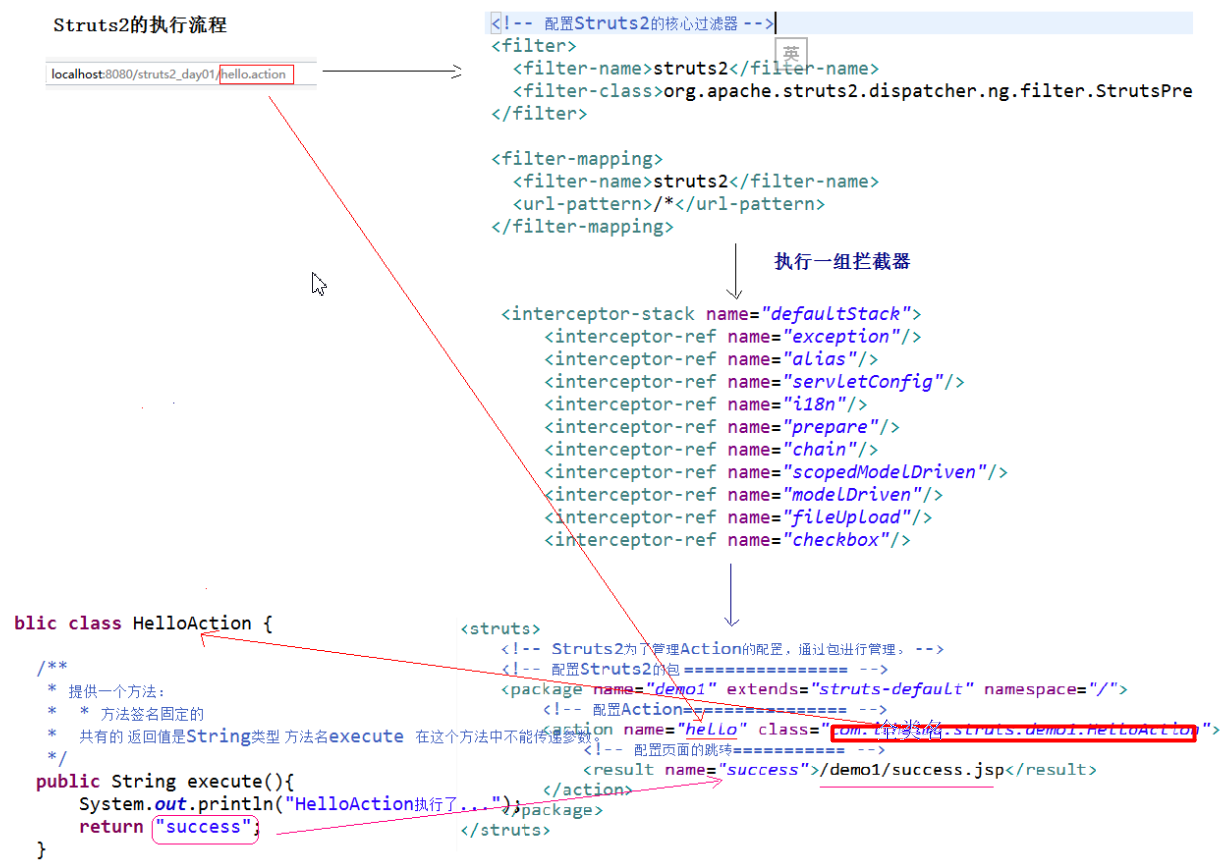 <?xml version="1.0" encoding="UTF-8"?> <!DOCTYPE struts PUBLIC "-//Apache Software Foundation//DTD Struts Configuration 2.3//EN" "http://struts.apache.org/dtds/struts-2.3.dtd"> <struts> <!-- Struts2为了管理Action的配置,通过包进行管理 --> <!-- 配置Struts2的包 --> <package name="demo1" extends="struts-default" namespace="/"> <!-- 配置Action --> <action name="hello" class="com.struts2.demo.HelloAction"> <!-- 配置页面的跳转 --> <result name="success">/success.jsp</result> </action> </package> </struts>