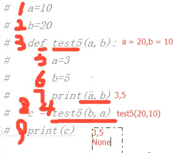 a=10 b=20 def test5(a,b): print(a,b) c = test5(b,a) #此处的b,a是常量不是变量 #上面语句的含义:先函数运行完,再把返回值赋给c,因为test5函数没返回值,故c为None print(c) #20 10 #None