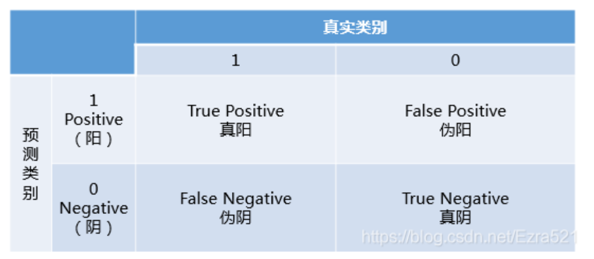 - 称预测类别为1的为Positive(阳性),预测类别为0的为Negative(阴性)。