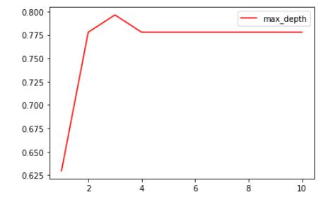 import matplotlib.pyplot as plt test = [] for i in range(10): clf = tree.DecisionTreeClassifier(max_depth=i+1 ,criterion="entropy" ,random_state=30 ,splitter="random" ) clf = clf.fit(Xtrain, Ytrain) score = clf.score(Xtest, Ytest) test.append(score) plt.plot(range(1,11),test,color="red",label="max_depth") plt.legend() plt.show()