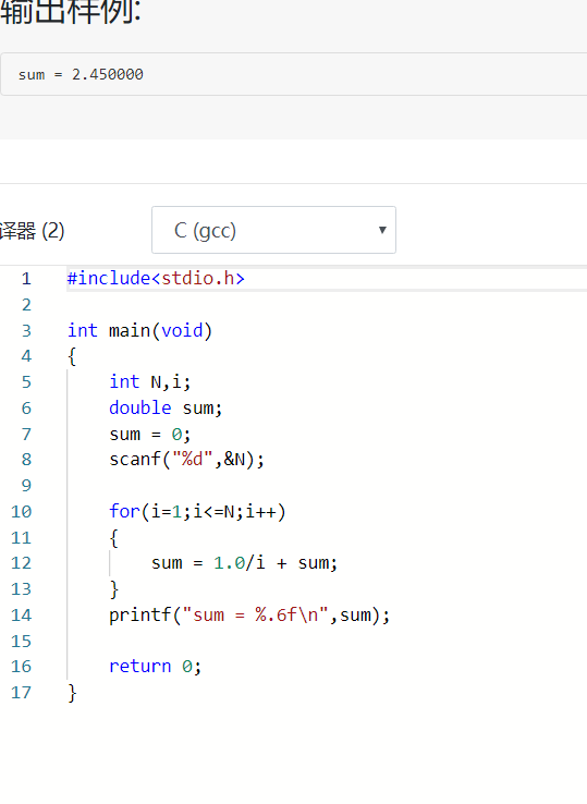输出格式:在一行中按照“sum = S”的格式输出部分和的值S,精确到小数点后六位。题目保证计算结果不超过双精度范围。