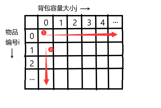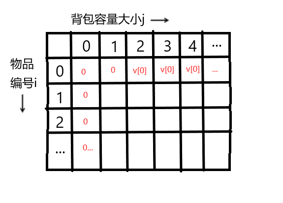 对于上面第一排,表示只有下标为0的物品时,背包容量不断扩大,所以是从某一容量(这一容量也就是物品0的重量了)起,物品0都被装的进去。