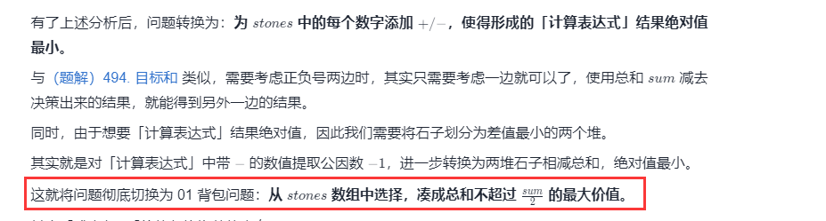 本文重点在01背包问题,至于怎么将问题转化为01背包问题的思路,直接借鉴大佬的思路