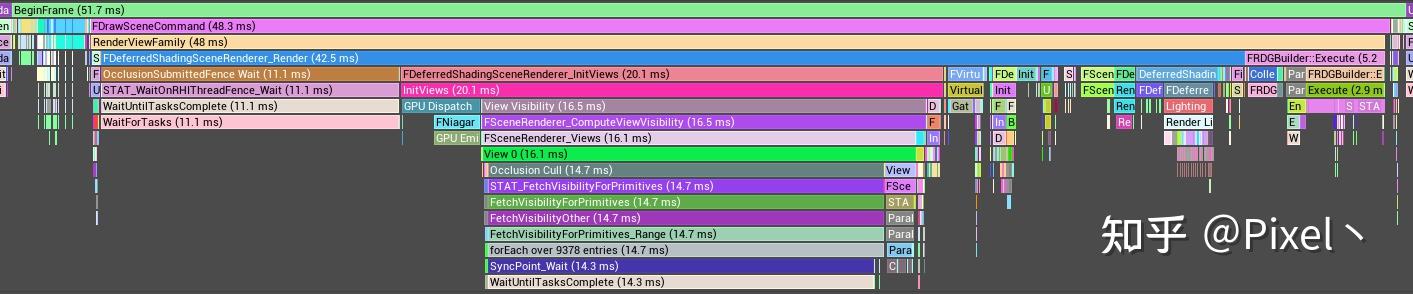 ②.FDeferredShadingSceneRenderer_InitViews(20.1ms):初始化视口相关数据耗时20.1ms。耗时较高的原因为:OcclusionCull耗时14.7ms,场景中有大量对象需要进行遮挡剔除操作。