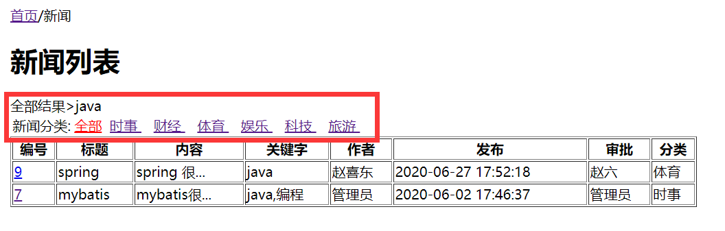 目标:在新闻列表页,增加新闻分类,时间的选择,关键词进行筛选新闻。