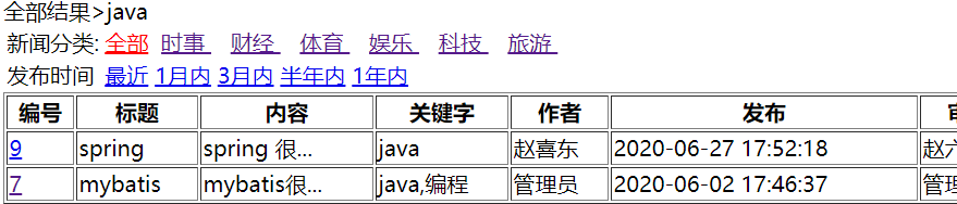 在页面中进行联合检索,关键字,分类,时间联合查询: