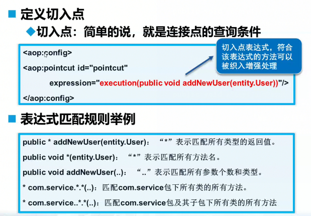 - 与面向切面的一些相关术语:增强处理(Advice)(有前置增强,后置增强,环绕增强,异常抛出增强,最终增强等类型。),切入点(Pointcut),连接点(Join Point),切面(Aspect),目标对象(Target objec),Aop代理(AOP proxy),织入(Weaving).