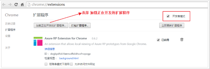 3、勾选开发者模式和选择“加载正在开发的扩展程序”