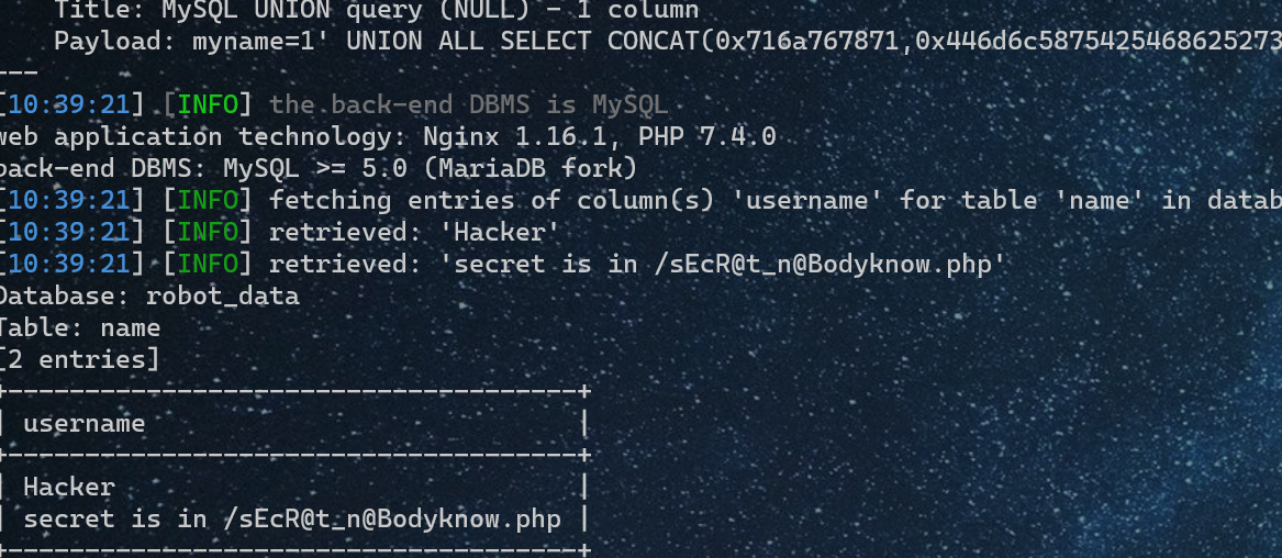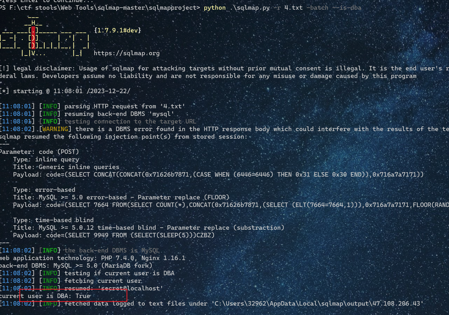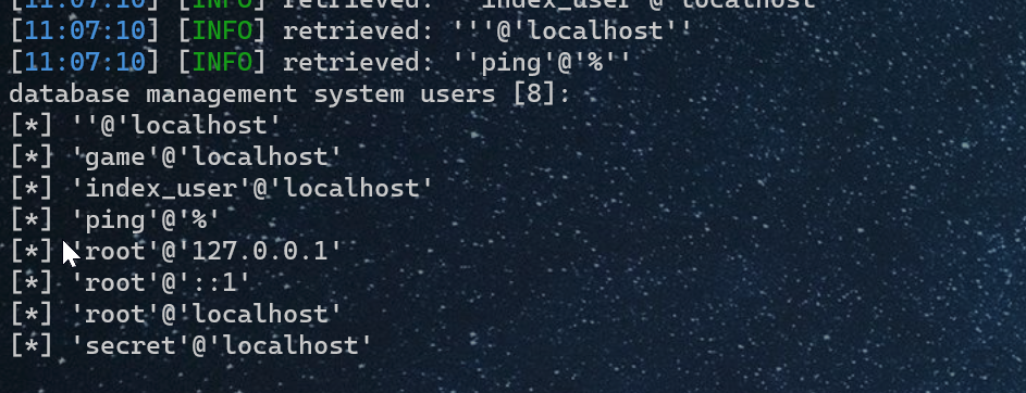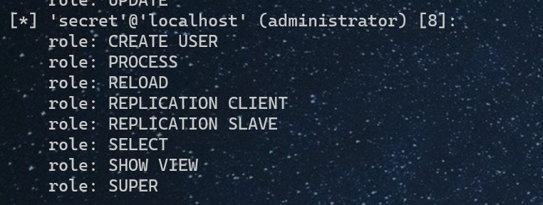 二次SQL注入,可以查看当前用户为'secret@localhost'