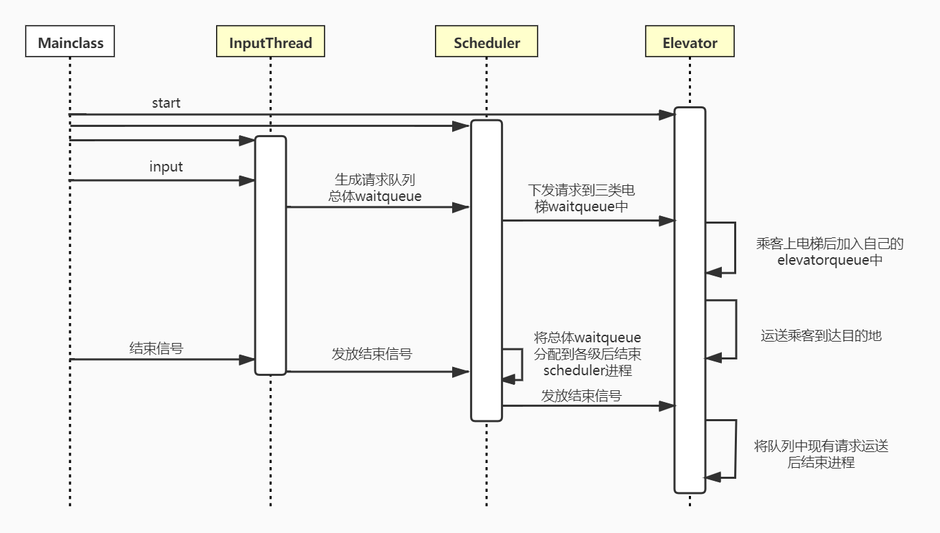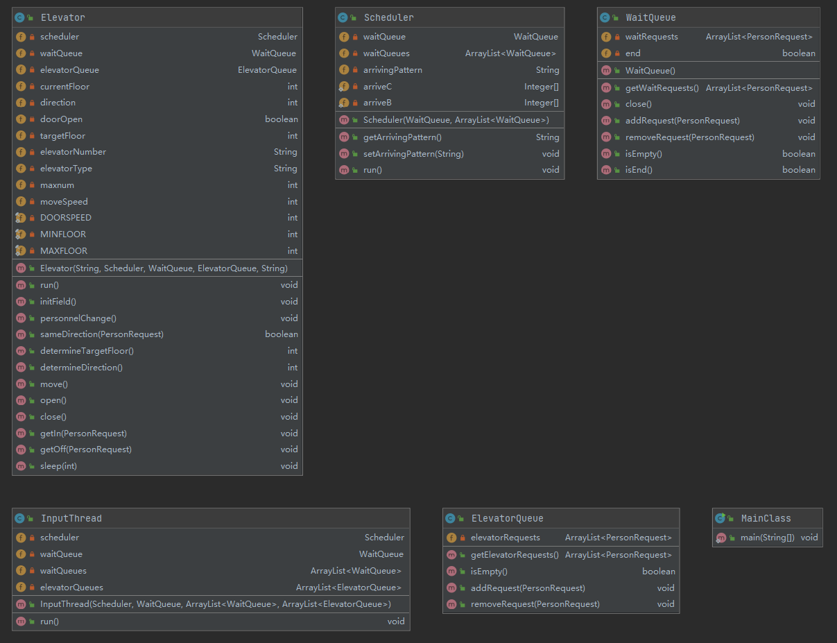 本次作业由3种thread类InputThread,Scheduler和Elevator;2种容器WaitQueue,ElevatorQueue;和MainClass构成。他们的组织结构如图所示。