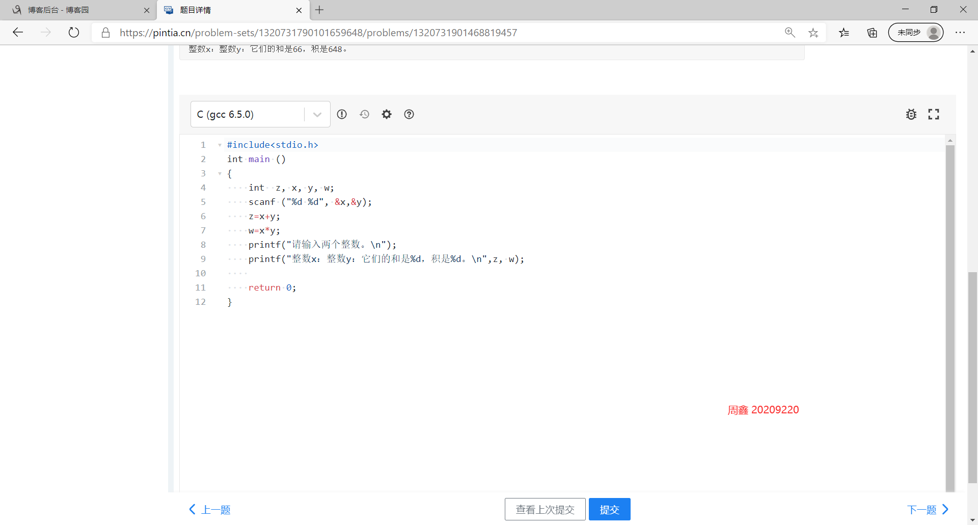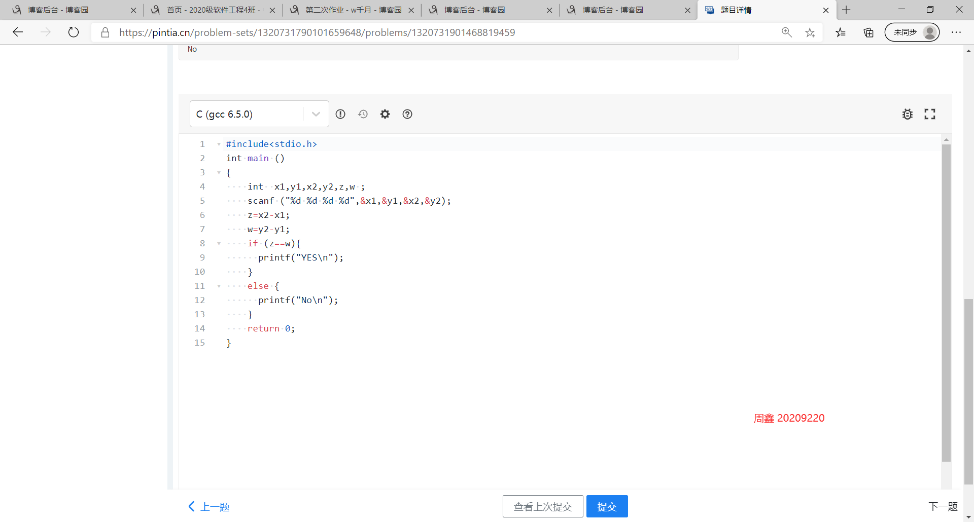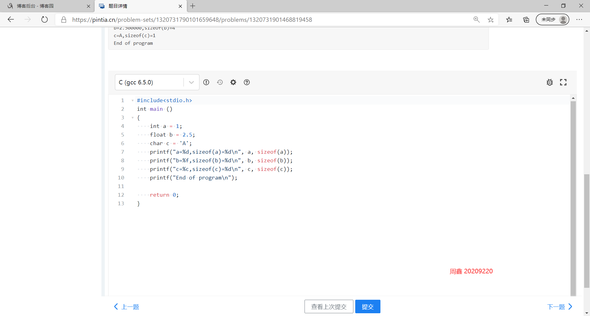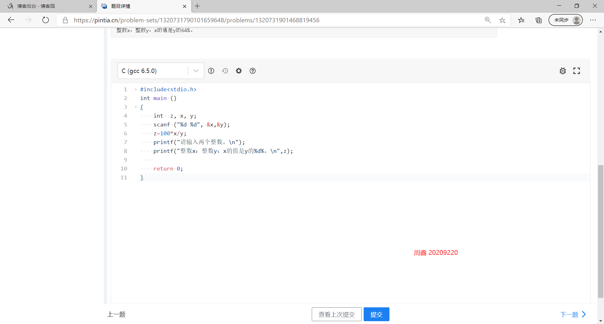 二: 请完成PTA作业:2020秋C语言作业2。在博客作业中贴出完成图片,图片要求存在自己的名字标识。
