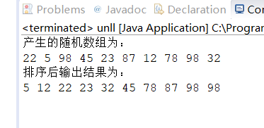 1 package as; 2 import java.util.Random; 3 public class unll { 4 public static void main(String[] args) { 5 // TODO Auto-generated method stub 6 int[] arr = new int[10]; 7 Random ran = new Random(); 8 System.out.println("产生的随机数组为:"); 9 for (int i = 0; i < arr.length; i++) { 10 arr[i] = ran.nextInt(100); 11 System.out.print(arr[i] + " "); 12 } 13 System.out.println(); 14 for (int i = 0; i < arr.length-1; i++) { 15 for (int j = 0; j < arr.length-1-i; j++) { 16 if (arr[j]>arr[j+1]) { 17 int temp = arr[j]; 18 arr[j] = arr[j+1]; 19 arr[j+1] = temp; 20 } 21 } 22 } 23 System.out.println("排序后输出结果为:"); 24 for (int i = 0; i < arr.length; i++) { 25 System.out.print(arr[i] + " "); 26 } 27 } 28 }