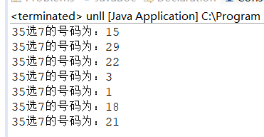 1 package as; 2 import java.util.Random; 3 public class unll { 4 public static void main(String[] args) { 5 // TODO Auto-generated method stub 6 int[] a = new int[7]; 7 Random b = new Random(); 8 for (int i = 0; i < 7; i++) { 9 a[i] = b.nextInt(35) + 1; 10 for (int j = 0; j < i; j++) { 11 if (a[j] == a[i]) { 12 i--; 13 } 14 } 15 } 16 for (int i = 0; i < a.length; i++) { 17 System.out.println("35选7的号码为:" + a[i]); 18 } 19 } 20 }
