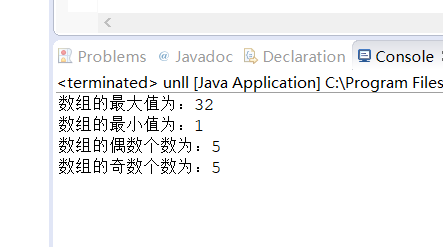 1 package as; 2 3 public class unll { 4 public static void main(String[] args) { 5 // TODO Auto-generated method stub 6 int a[] = {10,25,1,4,5,6,32,8,9,7}; 7 int max = a[0]; 8 int min = a[0]; 9 int countQ = 0; 10 int countO = 0; 11 for (int i = 0; i < a.length; i++) { 12 if (a[i]>max) { 13 max = a[i]; 14 } 15 if (a[i]<min) { 16 min = a[i]; 17 } 18 if (a[i]%2==0) { 19 countQ += 1; 20 }else { 21 countO += 1; 22 } 23 } 24 System.out.println("数组的最大值为:" + max); 25 System.out.println("数组的最小值为:" + min); 26 System.out.println("数组的偶数个数为:" + countO); 27 System.out.println("数组的奇数个数为:" + countQ); 28 } 29 }