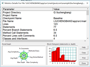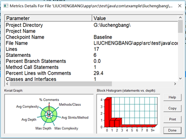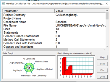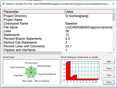 双击数据行后的结果如下图1-4到1-8所示。通过观察分析所得的代码复杂度的分析结果就可以让我们对自己的代码有了初步的了解,在以后的各种测试中也能让自己心中有所尺度。