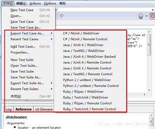 脚本编辑好之后,IDE还可以生成测试脚本,并提供导出功能,导出的代码可以在Eclipse上进行运行,有些版本的导出语言甚至可以有很多种,我们需要什么就选择什么,导出功能如图2-4所示,部分版本导出的可选版本如图2-5所示。
