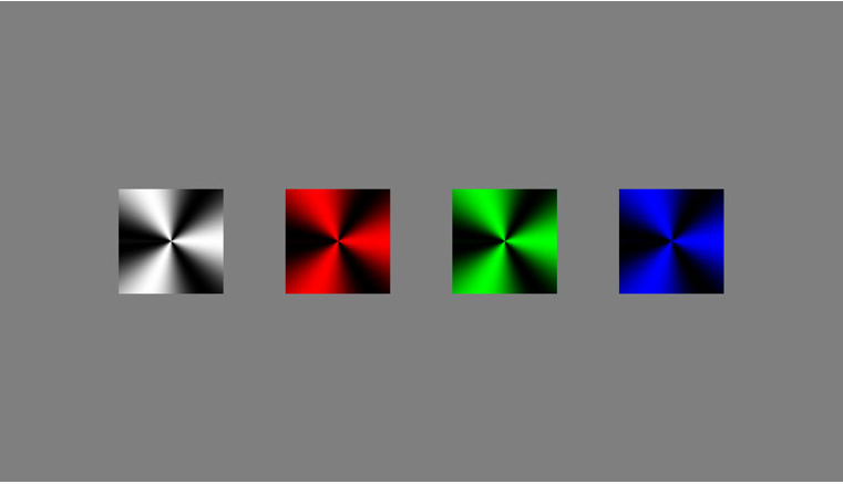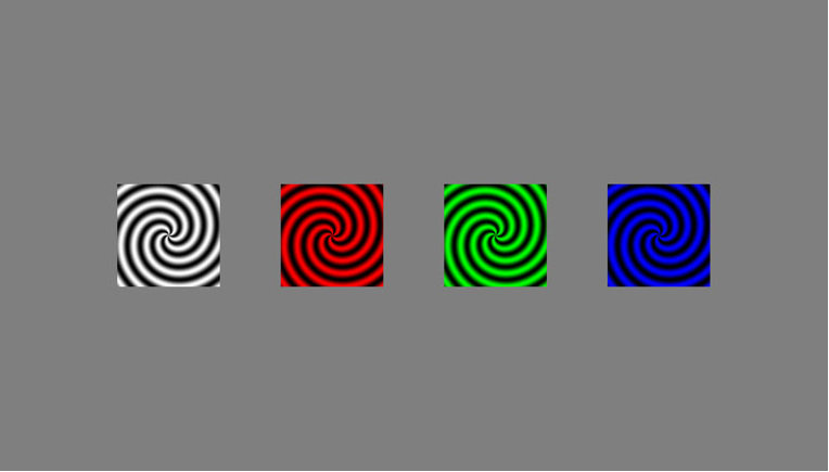 % Get the centre coordinate of the window [xCenter, yCenter] = RectCenter(windowRect); % Set up alpha-blending for smooth (anti-aliased) lines Screen('BlendFunction', window, 'GL_SRC_ALPHA', 'GL_ONE_MINUS_SRC_ALPHA'); % Define a simple spiral texture by defining X and Y coordinates with the 螺旋化的实现:转化为极坐标 % meshgrid command, converting these to polar coordinates and finally % defining the spiral texture [x, y] = meshgrid(-120:1:120, -120:1:120); [th, r] = cart2pol(x, y); spiral = grey + inc .* cos(r / 5 + th * 5); % Make our sprial texure into a screen texture for drawing spiralTexture = Screen('MakeTexture', window, spiral); % We are going to draw four textures to show how a black and white texture % can be color modulated upon drawing. yPos = yCenter; xPos = linspace(screenXpixels * 0.2, screenXpixels * 0.8, 4); % Define the destination rectangles for our spiral textures. For this demo % these will be the same size as out actualy texture, but this doesn't have % to be the case. See: ScaleSpiralTextureDemo and CheckerboardTextureDemo. [s1, s2] = size(x); baseRect = [0 0 s1 s2]; dstRects = nan(4, 4); for i = 1:4 dstRects(:, i) = CenterRectOnPointd(baseRect, xPos(i), yPos); end % Color Modulation colorMod = [1 1 1; 1 0 0; 0 1 0; 0 0 1]'; % Batch Draw all of the texures to screen Screen('DrawTextures', window, spiralTexture, [],... dstRects, [], [], [], colorMod); % Flip to the screen Screen('Flip', window);