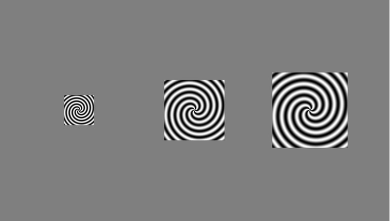 % Open an on screen window [window, windowRect] = PsychImaging('OpenWindow', screenNumber, grey); % Get the size of the on screen window [screenXpixels, screenYpixels] = Screen('WindowSize', window); % Query the frame duration ifi = Screen('GetFlipInterval', window); % Get the centre coordinate of the window [xCenter, yCenter] = RectCenter(windowRect); % Set up alpha-blending for smooth (anti-aliased) lines Screen('BlendFunction', window, 'GL_SRC_ALPHA', 'GL_ONE_MINUS_SRC_ALPHA'); % Define a simple spiral texture by defining cartasian X and Y coordinates % with the meshgrid command, converting these to polar coordinates % with cart2pol and finally defining the spiral texture [x, y] = meshgrid(-150:1:150, -150:1:150); [th, r] = cart2pol(x, y); spiral = grey + inc .* cos(r / 5 + th * 5); % Make our sprial texure into a screen texture for drawing spiralTexture = Screen('MakeTexture', window, spiral); % Define the destination rectangles for our spiral textures. For this demo % we will make the left hand destination rectangle half the size of the % texture, the middle one the same size as the texture and the right hand % on 1.25 times the size of the texture [s1, s2] = size(x); baseRect = [0 0 s1 s2]; dstRects = nan(4, 3); dstRects(:, 1) = CenterRectOnPointd(baseRect .* 0.5,... screenXpixels * 0.2, yCenter); dstRects(:, 2) = CenterRectOnPointd(baseRect,... screenXpixels * 0.5, yCenter); dstRects(:, 3) = CenterRectOnPointd(baseRect .* 1.25,... screenXpixels * 0.8, yCenter); % Batch Draw all of the texures to screen Screen('DrawTextures', window, spiralTexture, [], dstRects); % Flip to the screen Screen('Flip', window);