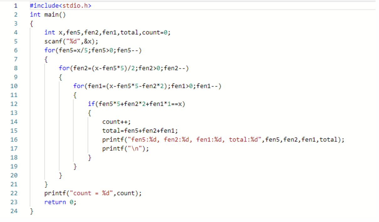 1.for循环内我是从可整除的最多的5分硬币开始递减循环,而第二个for也是从可整除的最多的2分硬币,到最后再判断符合条件。