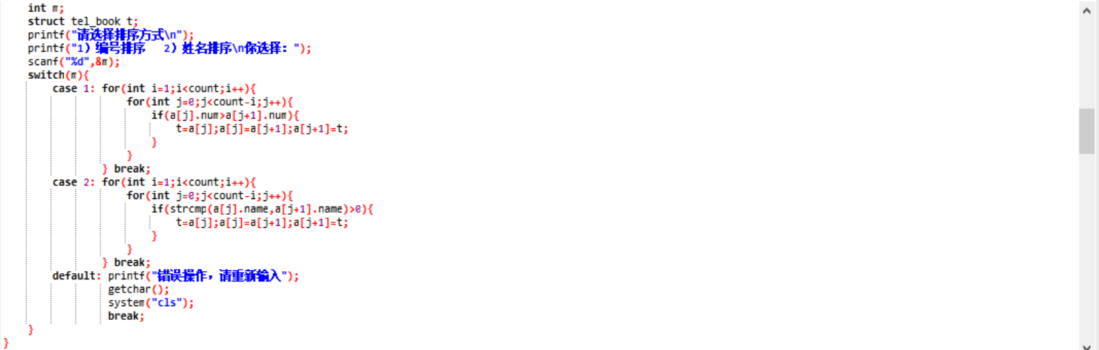 printf("1)编号排序 2)姓名排序\n你选择:");