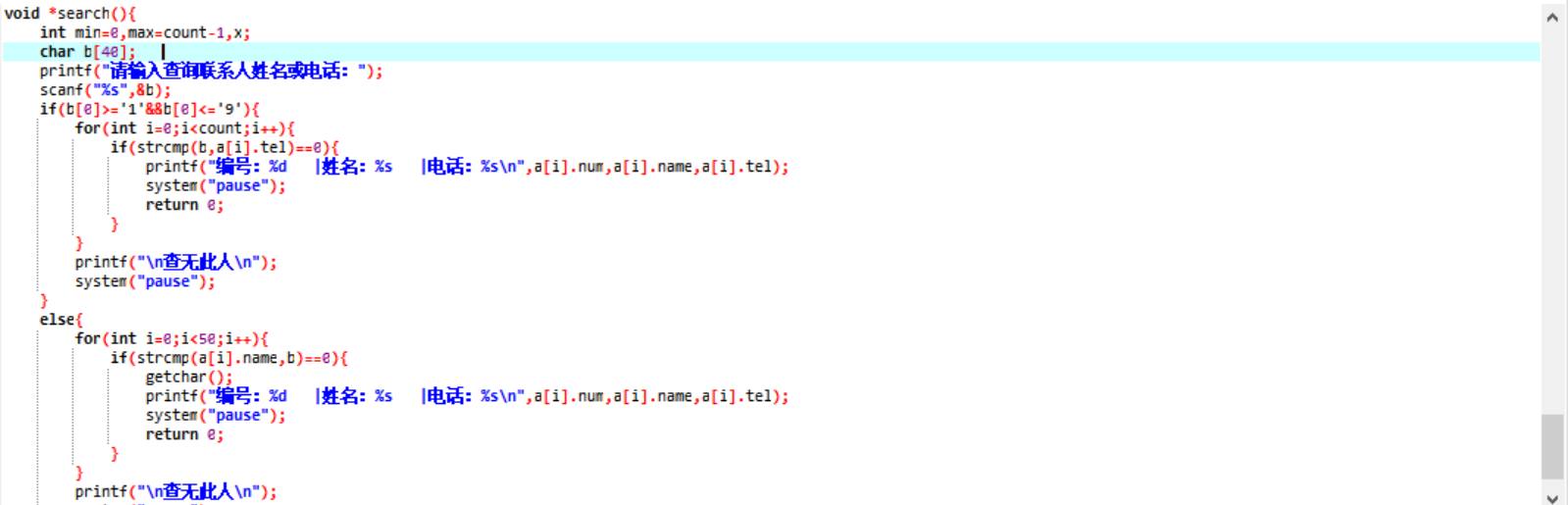 printf("请输入查询联系人姓名或电话:");