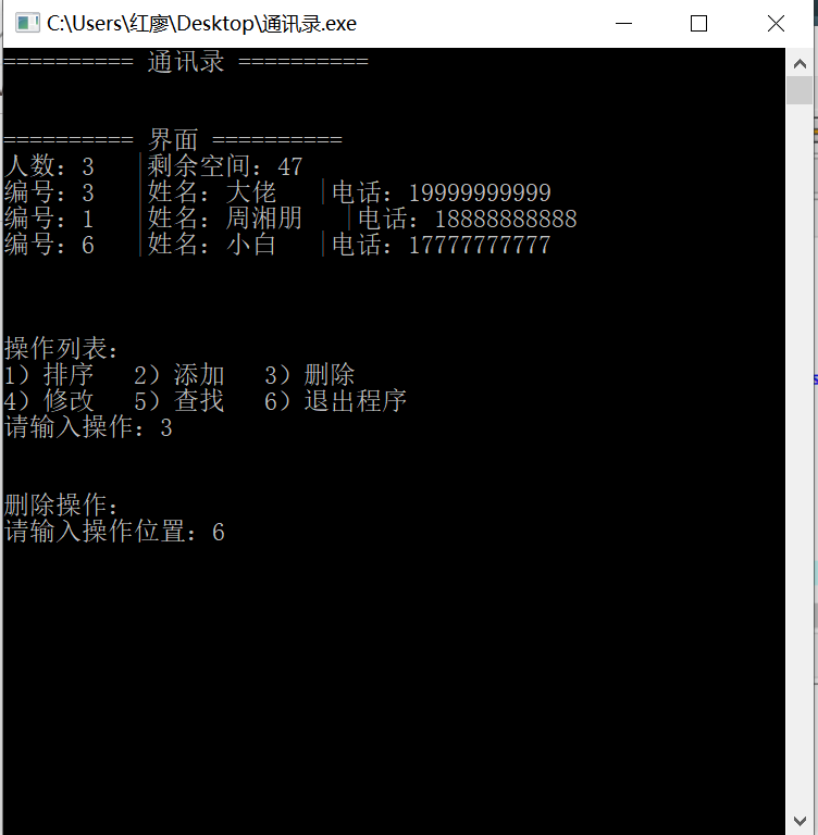 printf("1)排序 2)添加 3)删除\n4)修改 5)查找 6)退出程序\n");