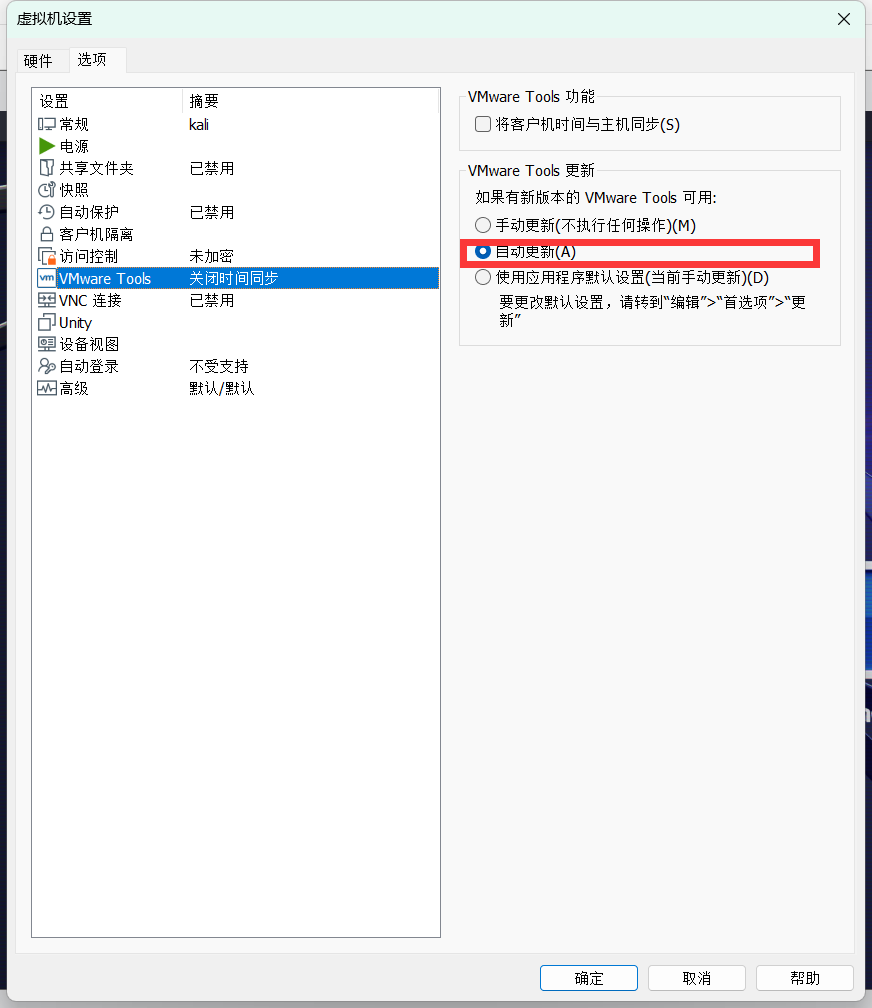 2.然后查找出现文件不能粘贴的原因,其中一个是VMware中的VMware-tools失效了,然后发现虚拟机设置选项中有关于VMware-tools自动更新的选项,尝试了一下,结果能够粘贴文件了。