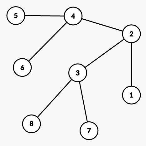 当我们以2为根节点时注意,如果我们5,6之间添加一条边,那么只有4,5,6号节点形成了环,不满足两点与根节点形成环的要求,应当添加6,8和5,7和2,1三条边。