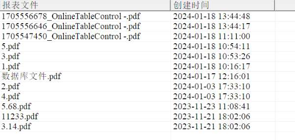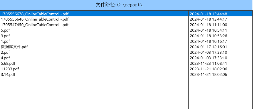 由于数据库缺少数据,所以随便打了两个数据上去,经供参考,同时,listview控件在获取文件,特别是在打印机静默打印生成报表的文件夹中获取文件名也是非常好用的,因为它可以多列在获取文件名的同时在第二列显示创建时间,listview和listbox的实例如下