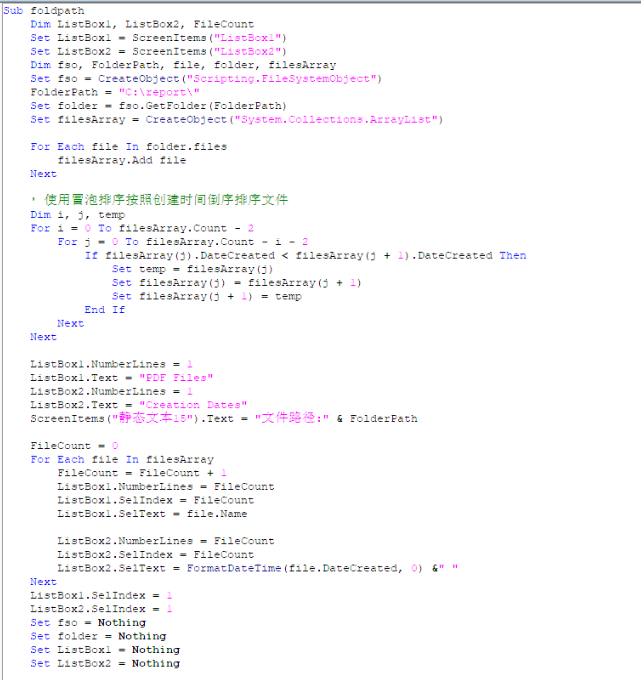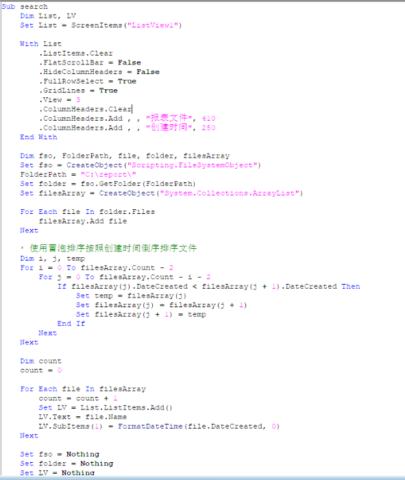 listview可以在同一张表格中输入多种信息,listbox我这里用了两个,一个显示文件名,一个显示创建时间,这就要多做seletline追踪项了,但是listbox的滚动栏不支持去做一些设置,所以后面用到listview完美解决,具体脚本放在下面了,配合wincc的趋势等控件,可以基本实现报表页所需的功能。