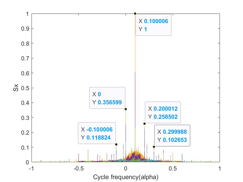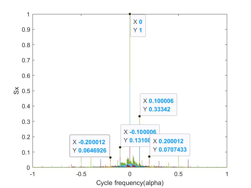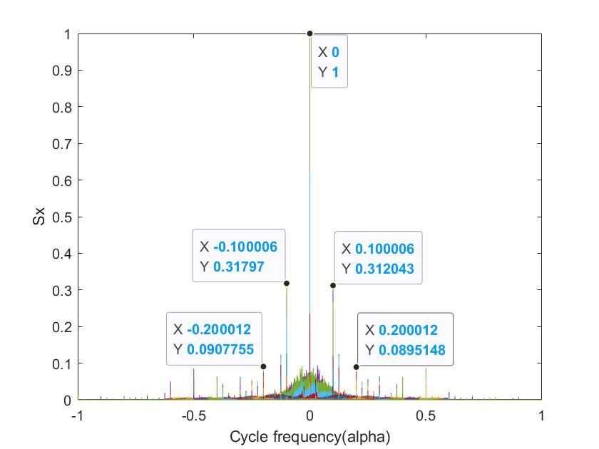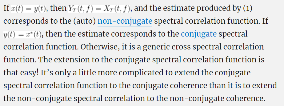 也就是说,y(t)=x(t)时,FAM算法计算非共轭循环频率,y(t)=conj(x(t))时,计算共轭循环频率(参考链接:comparison of cyclic correlation algorithm implemented in matlab and pythonPDF)