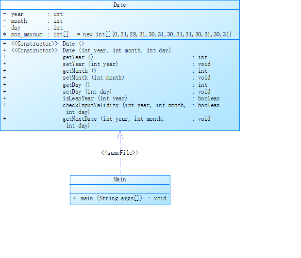 从这一道题开始,就考察了我们构造方法的知识和类与方法之间的关系、多个类的程序的语法,这一道题的难度并不是特别大,我的主要思路就是在判断下一天的时候,将跨年、跨月(2月闰年、非闰年跨月)这种特殊的情况单独拿出来判断,然后只是天数更改的总的进行判断,只要逻辑比较清晰,这道题很快就可以做得出来。