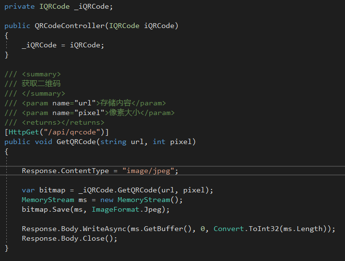 添加GetQRCode(string url, int pixel)方法,加入HttpGet("/api/qrcode")路由地址,方法里使用_iQRCode.GetQRCode(url, pixel)生成二维码再输出