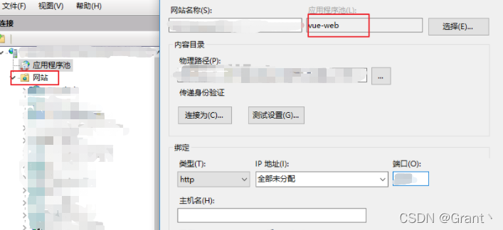 3.添加网站,应用程序池选择刚刚添加的无托管代码版本的程序池,路径选择vue发布所在的文件夹