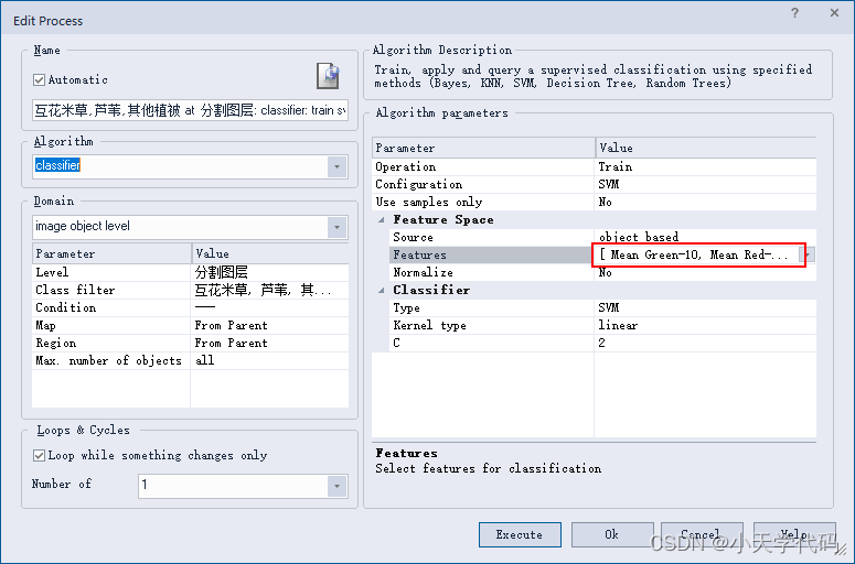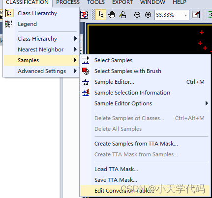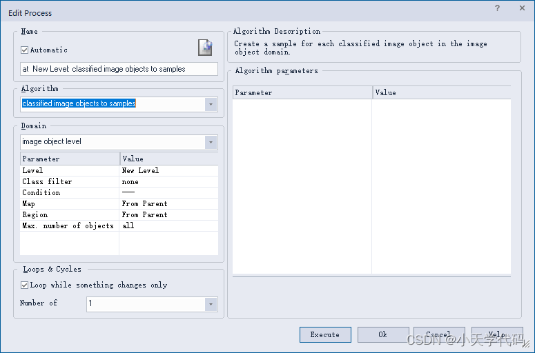 在 Process Tree 中,右键点击分类进程,在菜单中点击 Append New,新建一个进程,将分类结果转为样本。在 Edit Process 对话框中,Algorithm 设置为 classified image objects to samples,Class filter 中选none。