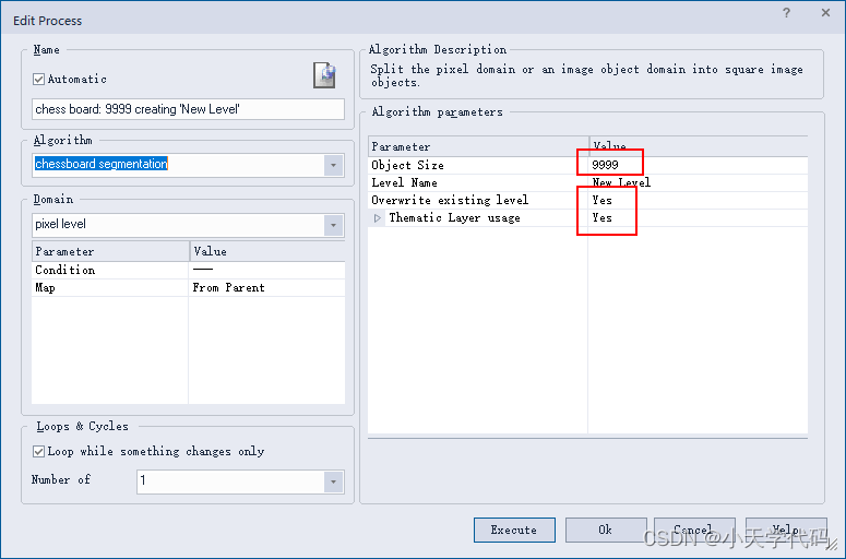 这里需要利用棋盘切割来获得像素级别的样本点。在 Process Tree 中,右键点击“结合矢量分割”目录进程,从菜单中点击 Insert Child,插入一个棋盘分割的子进程。在 Edit Process 对话框中,Algorithm 选择 chessboard segmentation,作用域中不需要修改,在算法参数中设置 Object Size 为 9999(因为要按照矢量轮廓分割影像,因此要将对象大小设置得要比影像大),Level Name 设置为 Level 1,Thematic Layer usage设置为让验证点矢量文件参与分割(点击 Thematic Layer usage 前面的折叠符号展开列表,点击 classification 和 point 旁边的 Value 栏上的折叠符号,展开后在下拉菜单中都点击 Yes)。