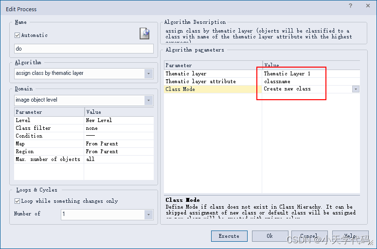 在 Process Tree 窗口中,右键点击”验证点转化为样本”,从菜单中点击 Insert Child,插入一个分类子进程。在 Edit Process 对话框中,Algorithm 选择 assign class by thematic layer(按照矢量属性表进行赋类),算法参数中设置 Thematic layer 为 point,Thematic layer attribute 设置为 class_name(利用验证点文件的 classname 字段进行赋类),Class Mode 设置为 Create new class(由于影像还没有分类,要新建类别)。