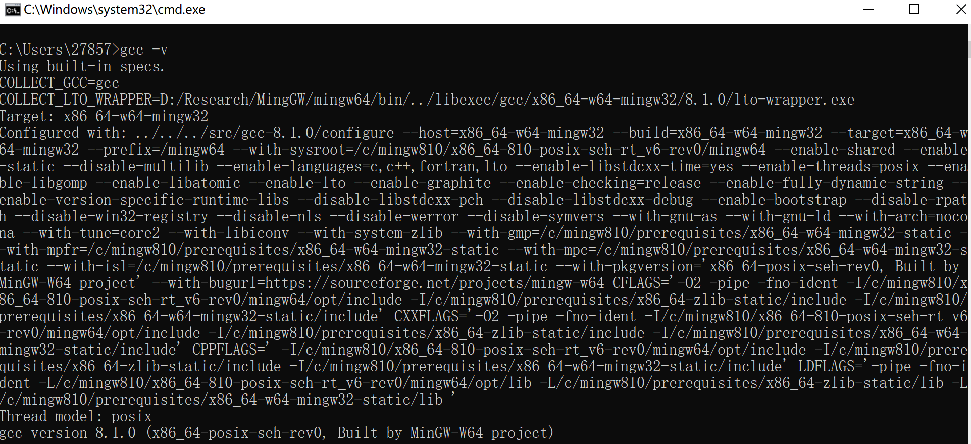 经过Mingw-w64的安装以及环境变量的配置,在cmd通过gcc -v命令检查发现,gcc已经配置成功。如下图: