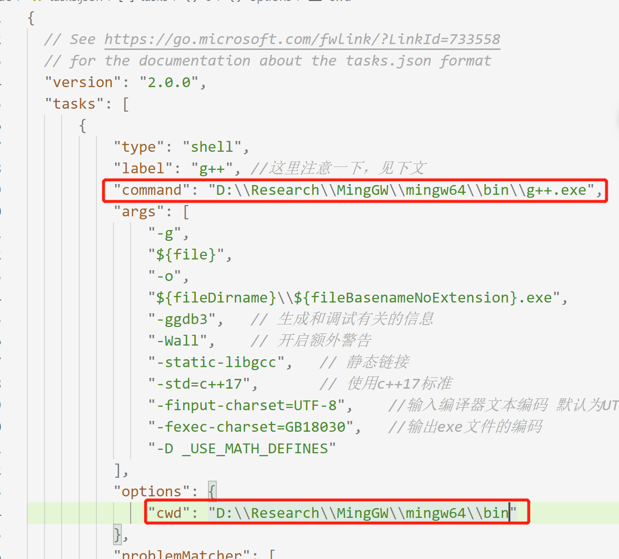 - tasks.json: 修改command和cwd为自己的路径
