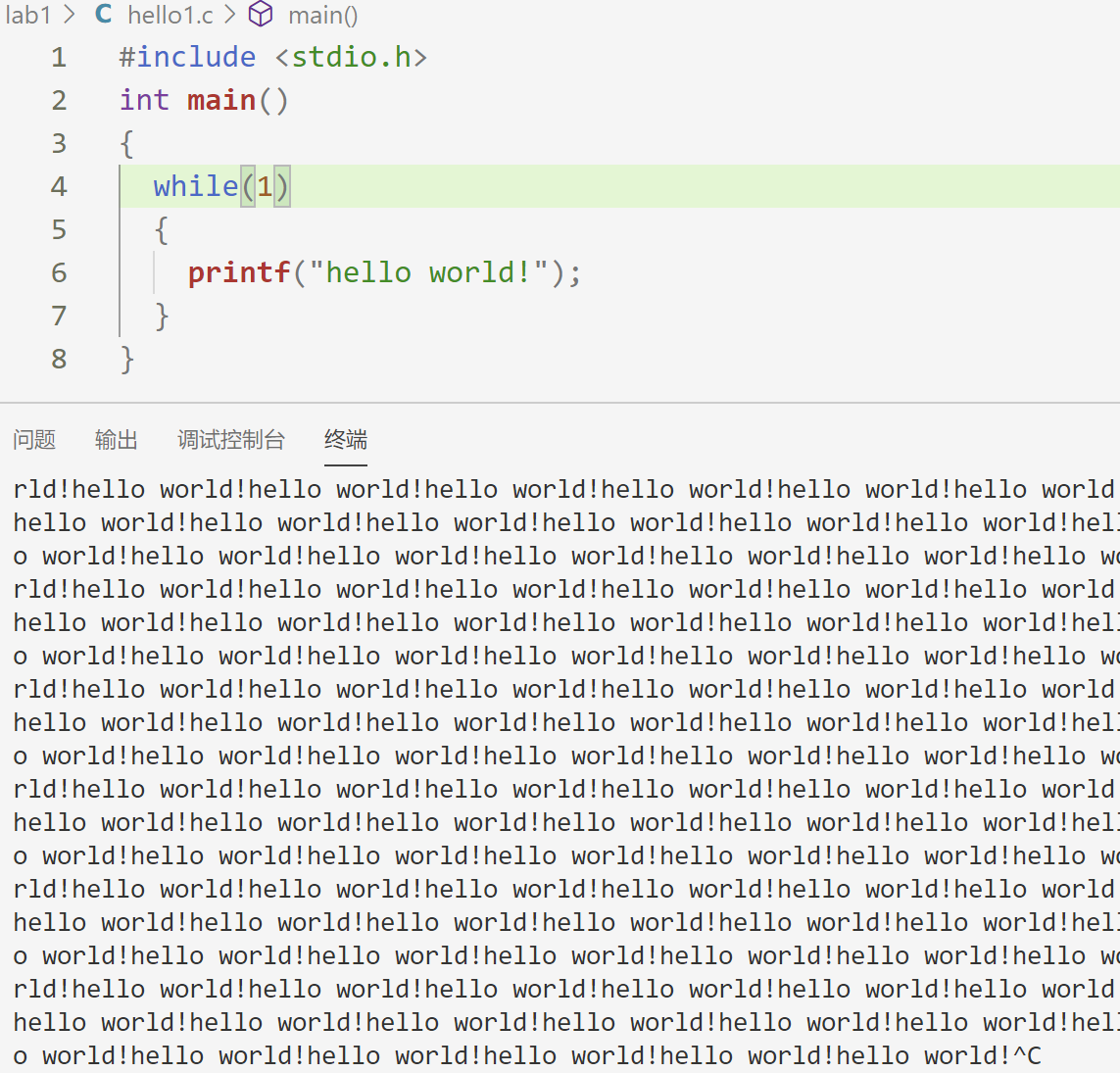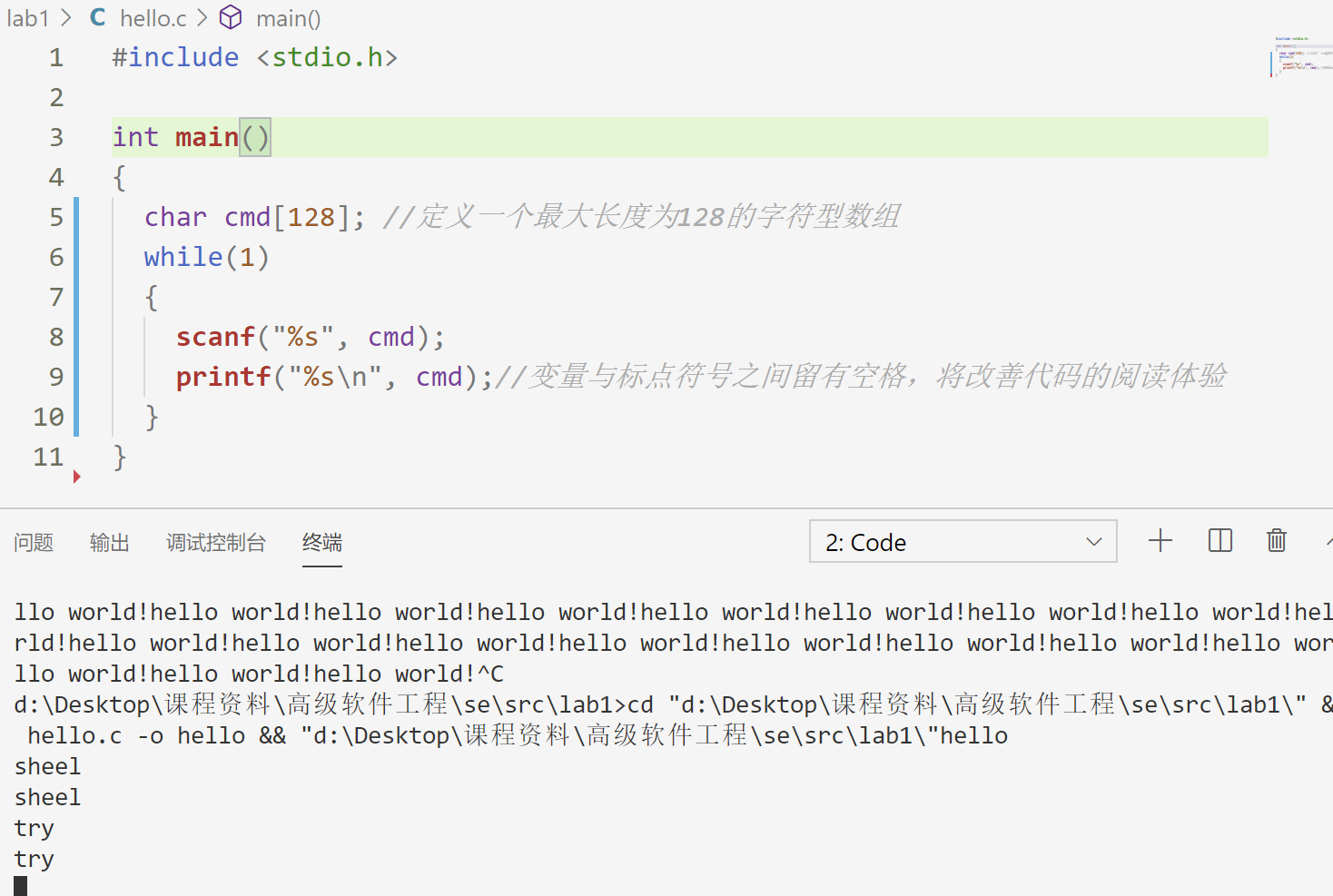 编译运行可以看到shell终端上不断打印出"hello world",这证明这个主循环结构是可以工作的,这样每添加一点代码就要编译运行一下,不断迭代即使发现编码错误,而不是一次性写很多代码积累很多编码错误。