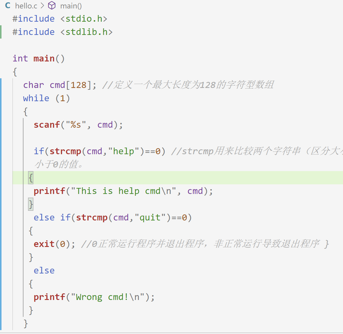 编译运行之后,此程序可以根据用户的需要来针对性的提供服务,输入help会打印this is help cmd,输入quit则程序结束,输入其他的命令,会打印wrong cmd。