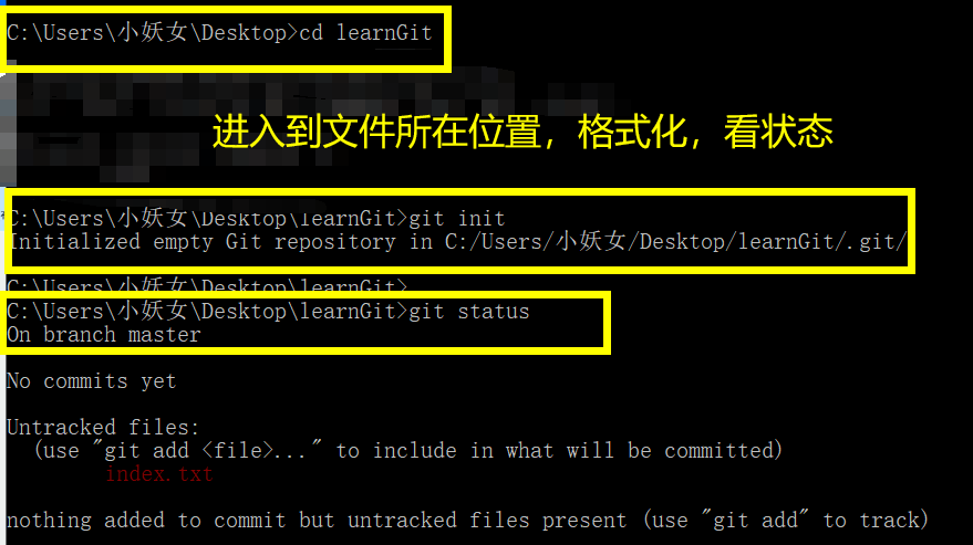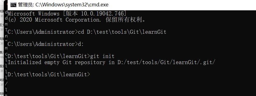 手动建好文件夹(ag:文件夹名字是learnGit),在控制台进入到文件夹