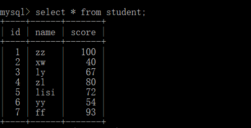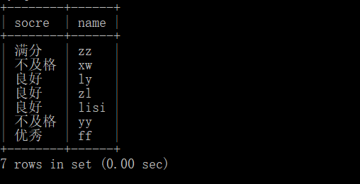 命令:select (case when score=100 then "满分" when score>=85 and score<100 then "优秀" when score>=60 and score<85 then "良好" when score<60 then "不及格" end)socre,name from student;
