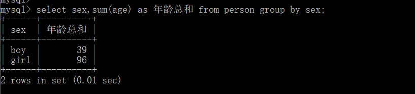 select sex,sum(age) as 年龄总和 from person group by sex;