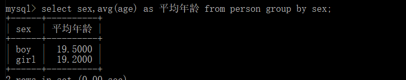 select sex,avg(age) as 平均年龄 from person group by sex;